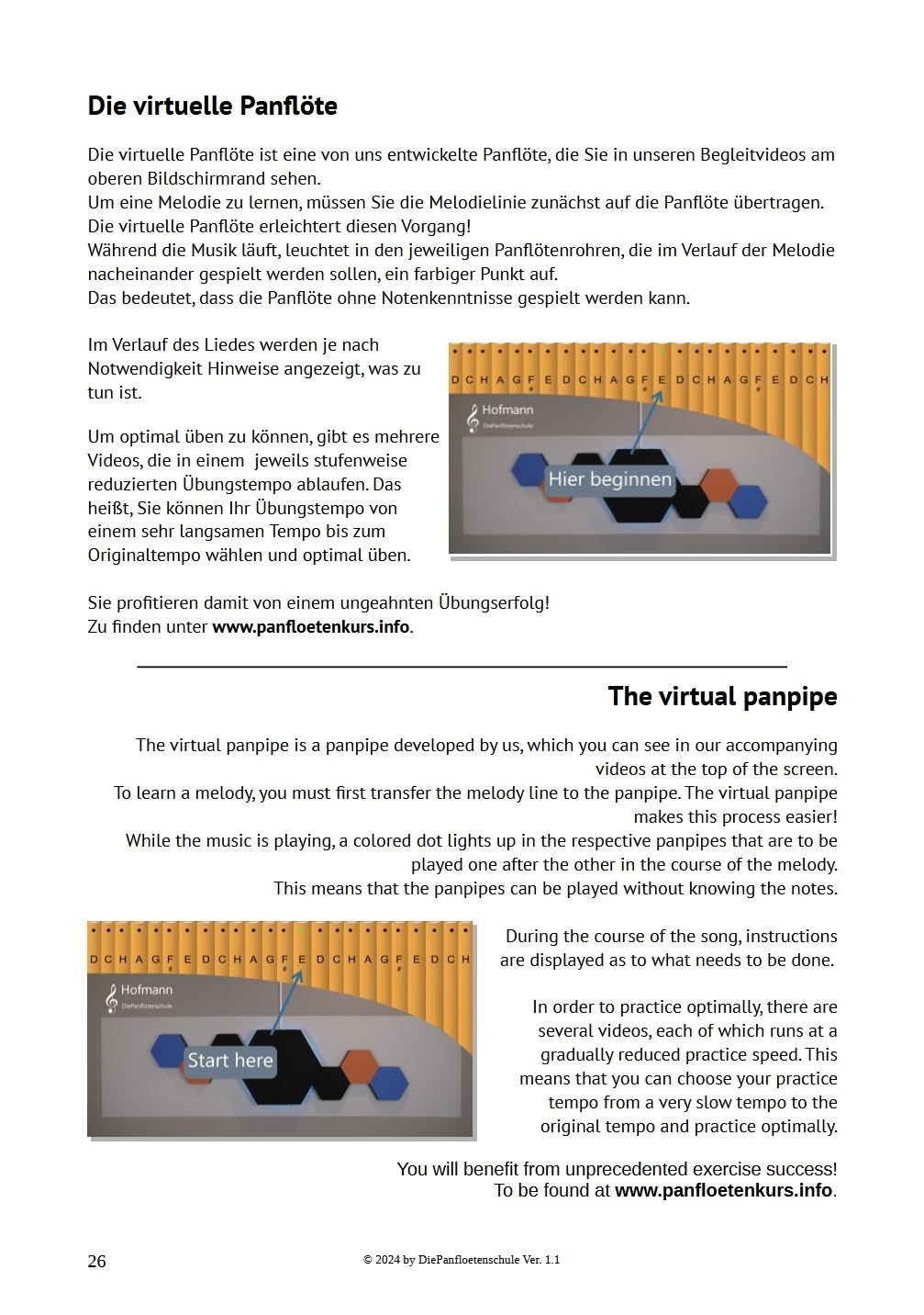 Die virtuelle Panflöte ist eine von uns entwickelte Panflöte, die Sie in unseren Videos am oberen Bildschirmrand sehen können. Sie enthält auf jedem Tonrohr einen Punkt, der im Verlauf des Liedes Grün aufleuchtet und anzeigt, welcher Ton gespielt werden muss. Halbtöne werden in der Farbe Rot angezeigt, so sieht man sofort, dass dieser Ton „gekippt“ angespielt werden muss. Um optimal üben zu können, sind die Videos in verschiedenen Tempostufen vorhanden. Die langsamste Tempostufe ist 60% vom Originaltempo. Je nach Notwendigkeit werden Hinweise angezeigt, was im Verlauf des Liedes zu tun ist.