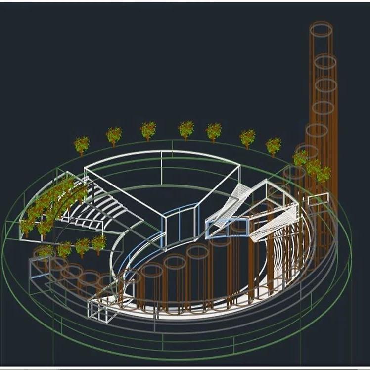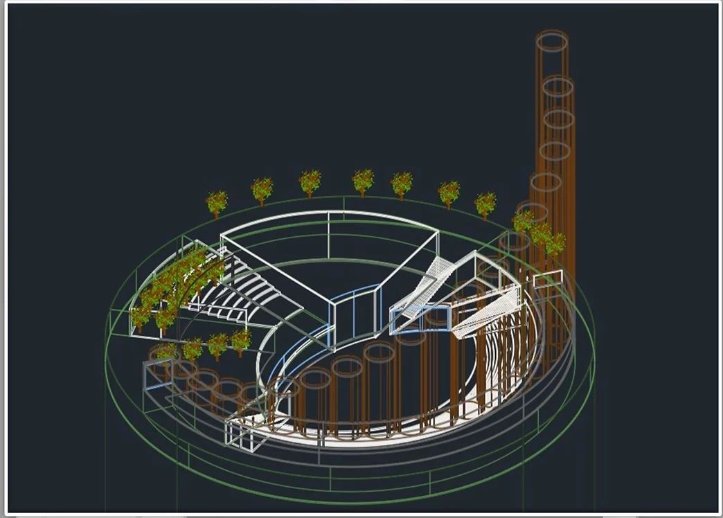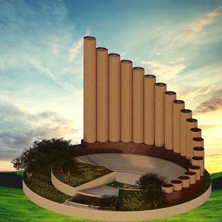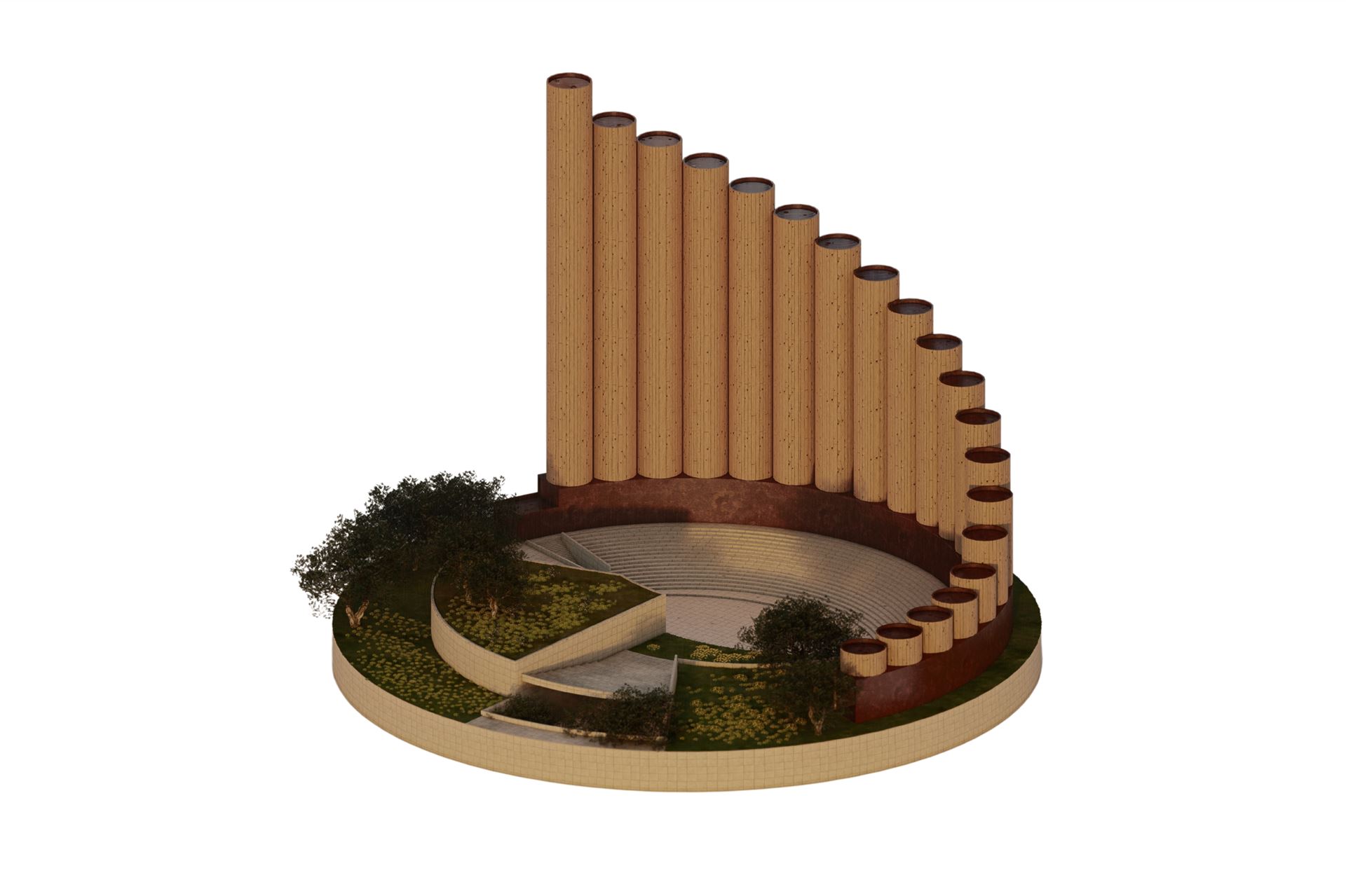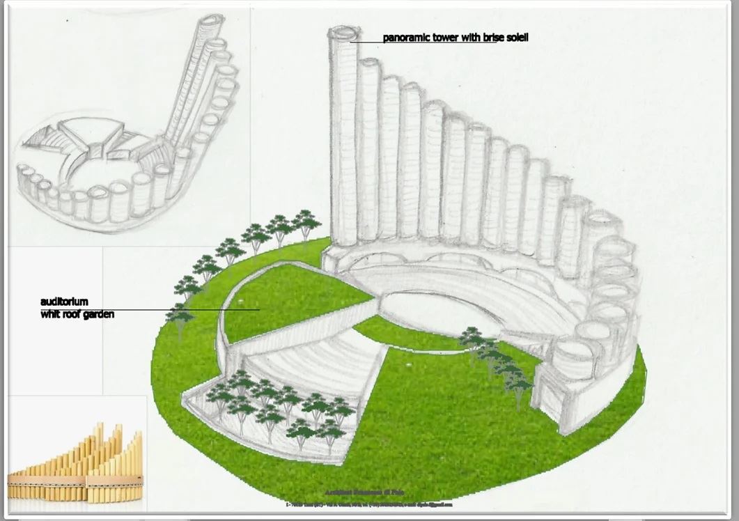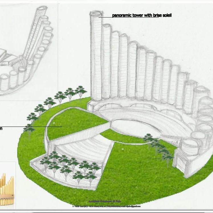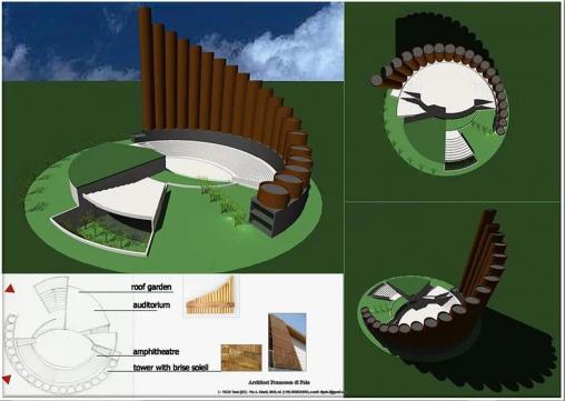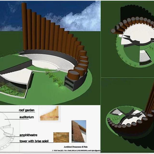 Das Projekt geht von der Idee aus, ein Mehrzweck-Kulturzentrum zu schaffen, das dem Vergnügen, der künstlerischen Produktion und der Verbreitung von Kunst auf eine spezifische und besonders musikalische Weise dient. Die Struktur ist in 4 Bereiche unterteilt: - Das Amphitheater - Die Zephyr-Türme - Die Hülle - Das Auditorium