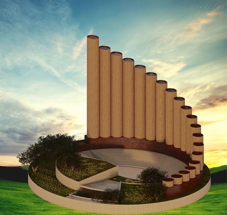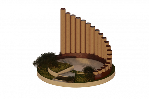 Das Amphitheater ist vollständig aus weißem TRANI-Stein gebaut. Es besteht aus kreisförmigen Stufen, die eine Gesamtfläche von 1300 m² bedecken und Platz für eintausend Personen bieten. Dahinter, um es zu schützen, erhebt sich in einer idealen "Umarmung" die vertikale Struktur, die aus 20 kreisförmigen Elementen (den Panflötenrohren) besteht, die jeweils einen Durchmesser von 10 Metern haben und auf verschiedenen Ebenen durch interne Treppen und Aufzüge miteinander verbunden sind.